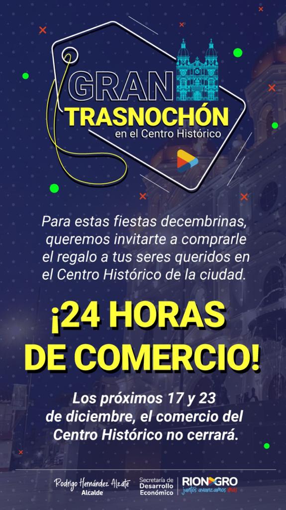 La alcaldía de Rionegro, desde la secretaría de Desarrollo Económico busca apoyar sus comerciantes, por esto hoy sábado 17 de diciembre y el próximo viernes 23 de diciembre todo el centro histórico de este municipio tendrá una jornada comercial de 24 horas. Esto con el fin que todos los ciudadanos, tanto propios como visitantes puedan venir a este lugar para comprar sus regalos para está navidad.