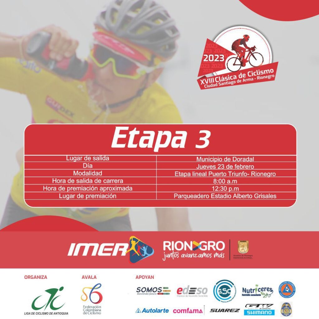 Febrero 23 – Etapa 3 Doradal – Rionegro Mirador de Samaná – Rionegro Élite – Sub 23 Damas Única – Juveniles Distancia: 131 km. Distancia: 90 km.