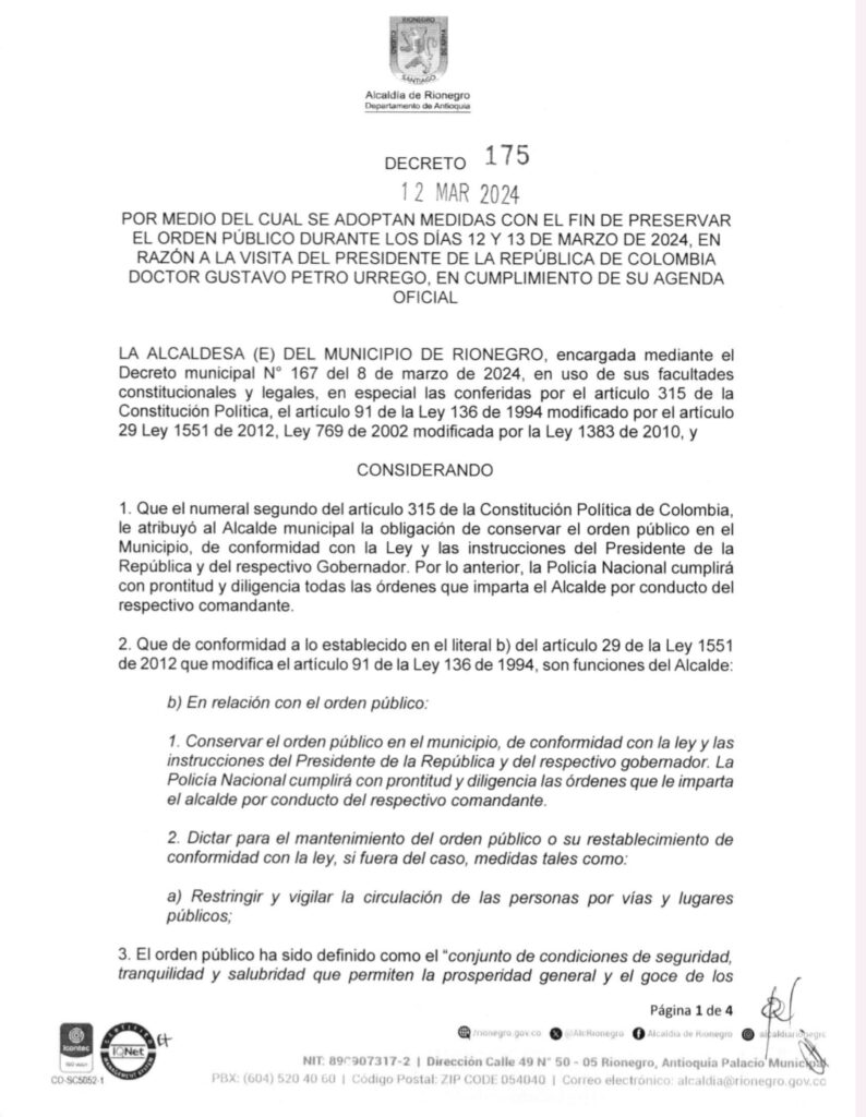 Por medio del decreto 175 del 12 de marzo del 2024, el municipio de Rionegro declaró la alerta amarilla por los días 12 y 13 de marzo, por motivo de la visita del Presidente Gustavo Petro, quién estará cumpliendo agenda oficial en el municipio.