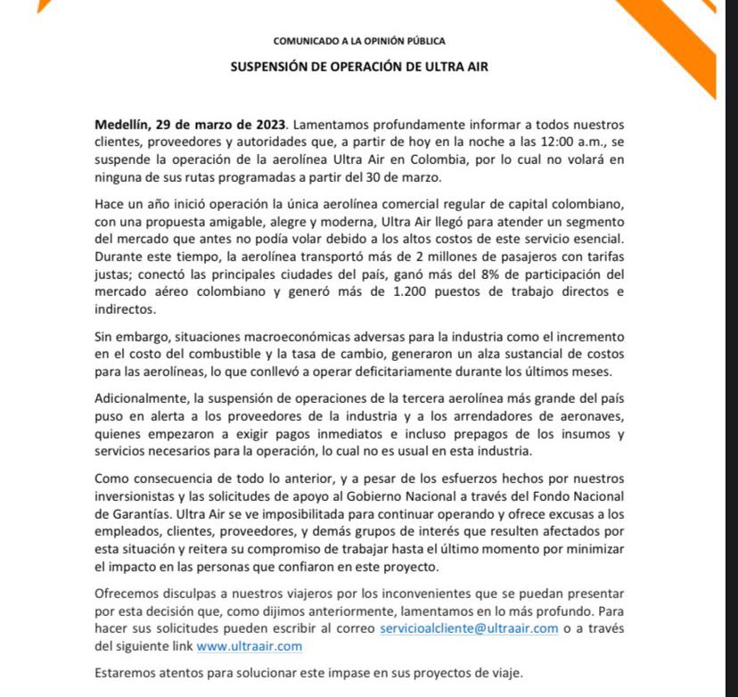 Comunicado de la Aerolínea Ultra Air