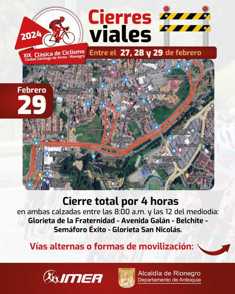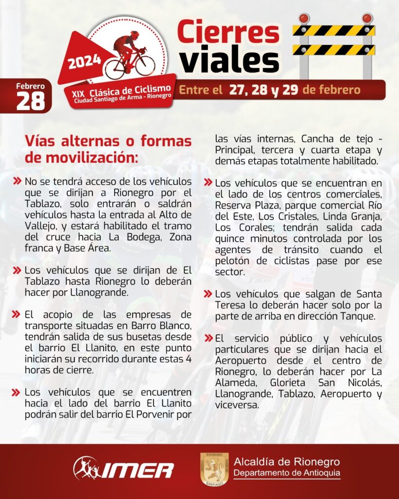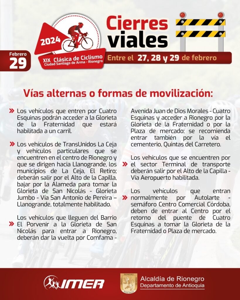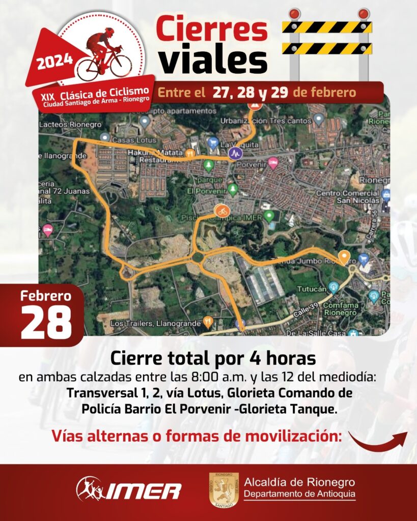 ¡Atento a los cierres viales! Este martes 27 de febrero inicia La Clásica de Ciclismo en Rionegro.