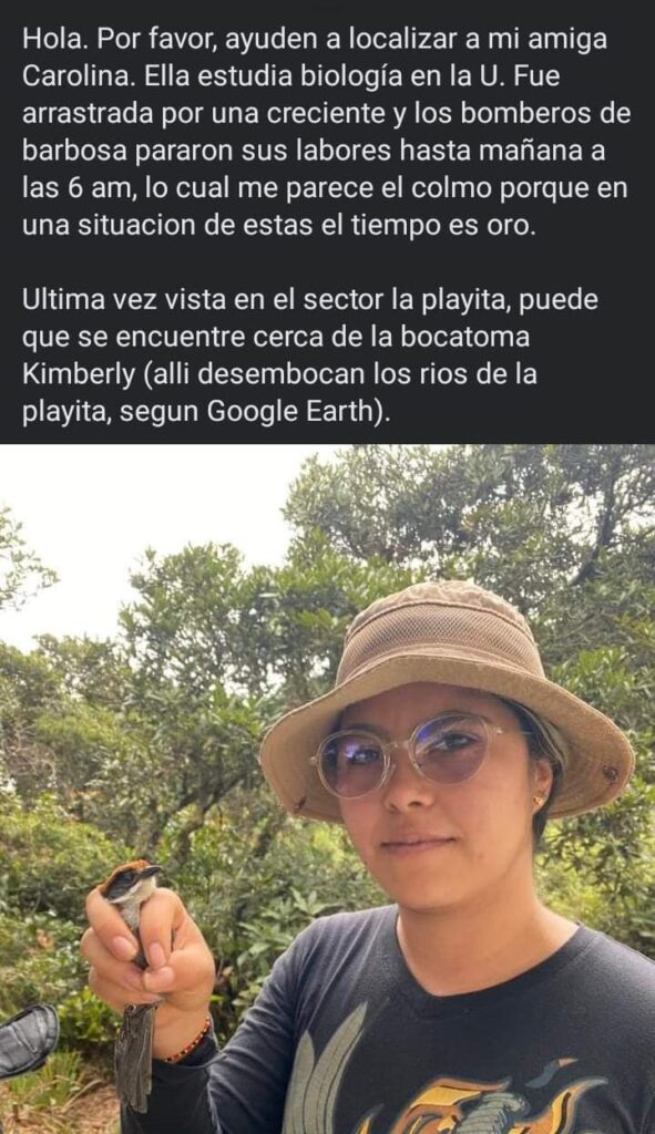 Según reportan desde el municipio de Marinilla, la joven estudiante de Biología en la Universidad de Antioquia, se encontraba junto a otras compañeras en el sector La Playita en Barbosa, realizando una investigación para su tesis de grado, cuando fueron sorprendidas por una creciente súbita.