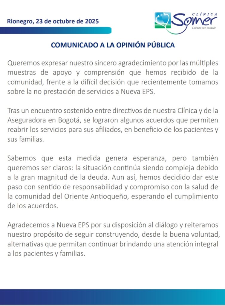 La institución médica expresó su agradecimiento por las muestras de apoyo y comprensión recibidas por parte de la comunidad del Oriente antioqueño frente a la decisión que habían tomado días atrás, y destacó que el diálogo con la aseguradora permitió avanzar hacia una solución que beneficie a los pacientes y sus familias.