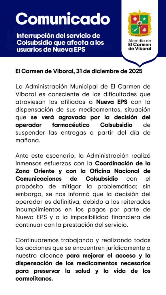 La Administración Municipal de El Carmen de Viboral informó que a partir del 1 de enero del 2026, se interrumpirá el servicio de dispensación de medicamentos para los afiliados a Nueva EPS, debido a la decisión del operador farmacéutico Colsubsidio de suspender las entregas en el municipio.