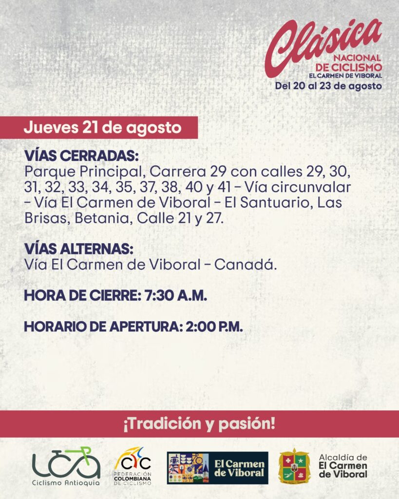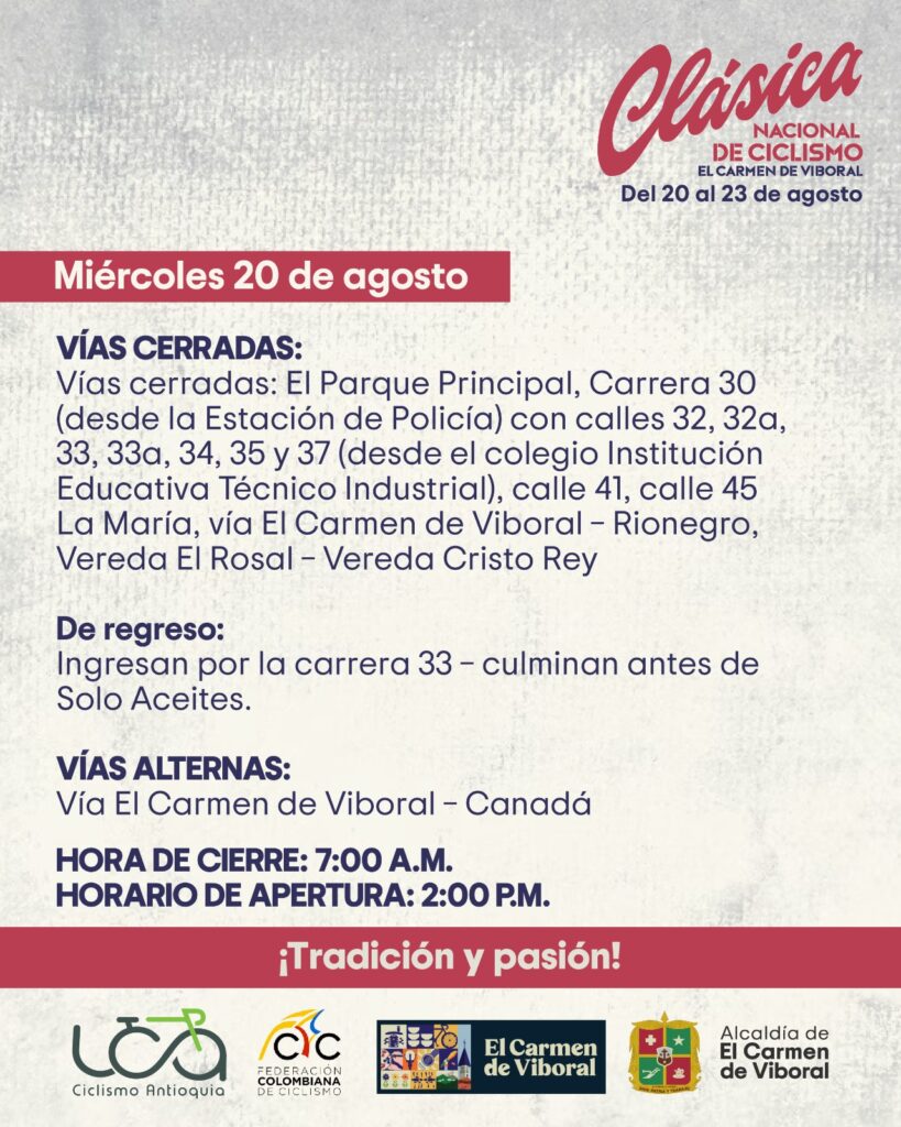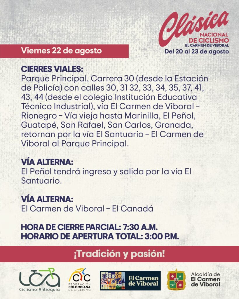 Las autoridades municipales informaron que durante las jornadas de competencia se implementarán cierres viales en los municipios por donde pasará la carrera, con el fin de garantizar la seguridad de los ciclistas y el público asistente.