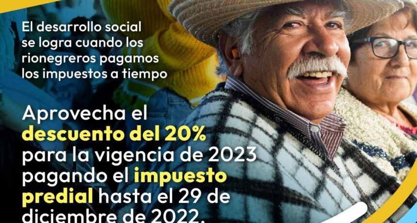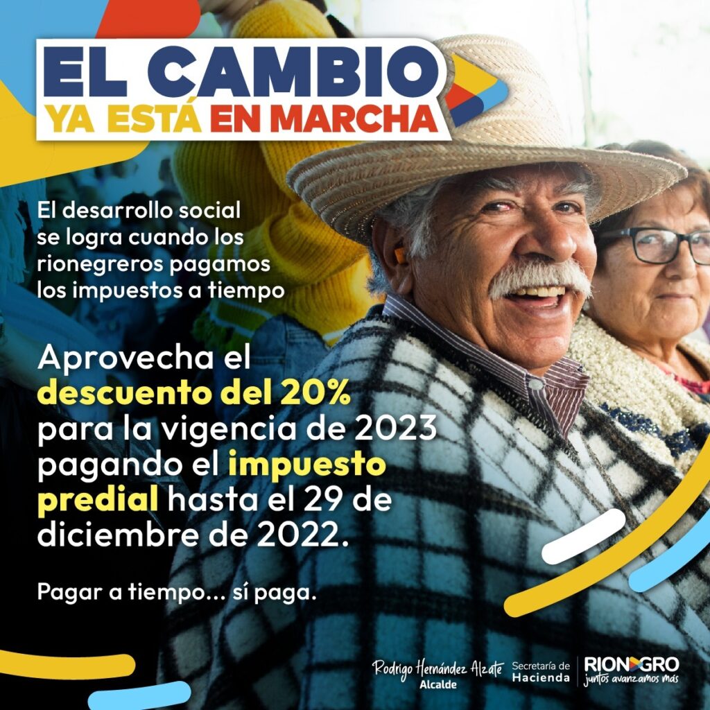 Desde la Secretaría de Hacienda de Rionegro actualmente se promueve una campaña para incentivar la cultura del pronto pago del impuesto predial, con el beneficio de un descuento del 20% por el pago anticipado, para la vigencia del año 2023, si se hace hasta el 29 de diciembre de 2022.