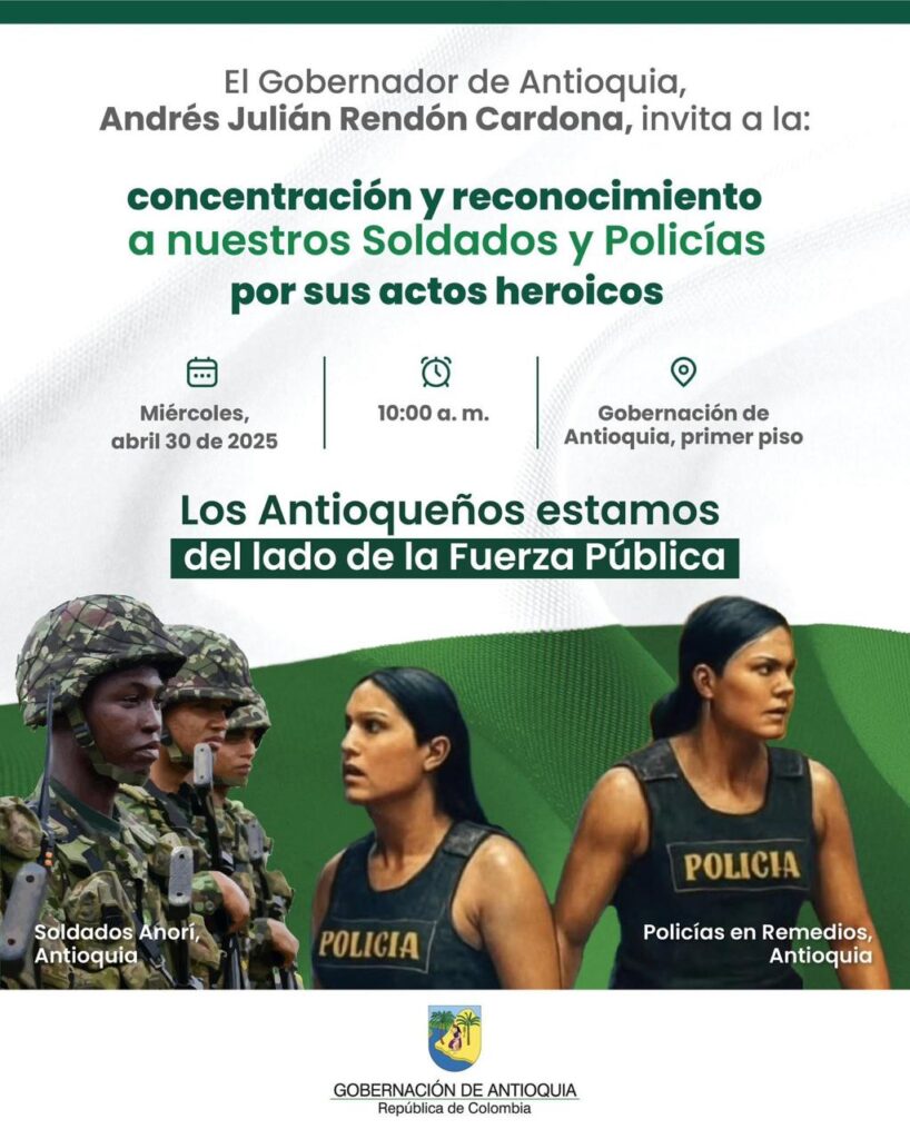 “Ante los atentados que ha sufrido la Fuerza Pública en los últimos días en el departamento y el país, el Gobernador Andrés Julián invita a los Antioqueños a un homenaje que se hará a nuestros Soldados y Policías, que se realizará este miércoles, 30 de abril a las 10:00 a.m. en el Centro Cívico de Antioquia Plaza de La Libertad, en el sector de La Alpujarra.” Escribieron desde la Gobernación.