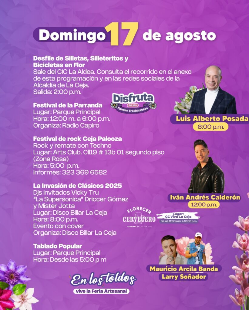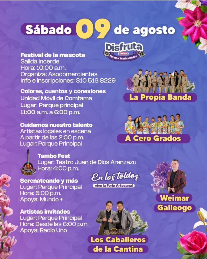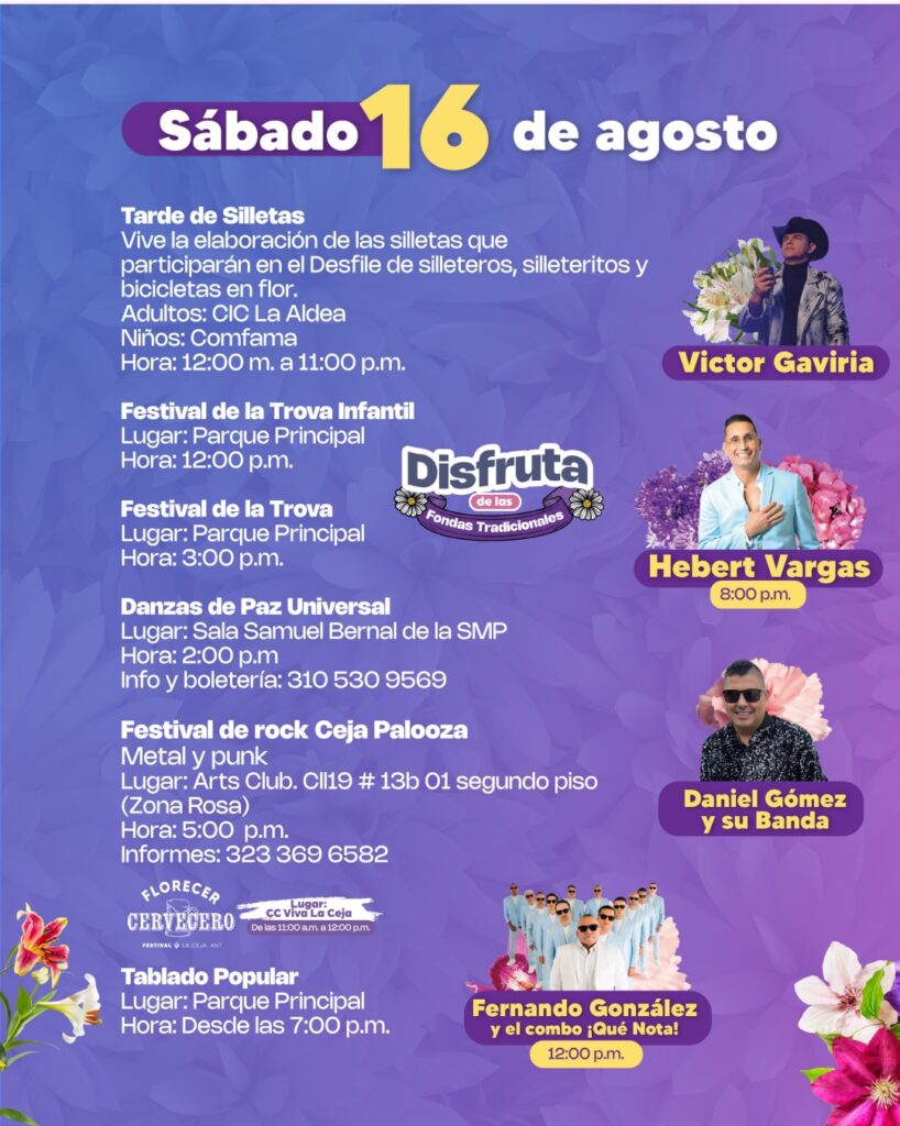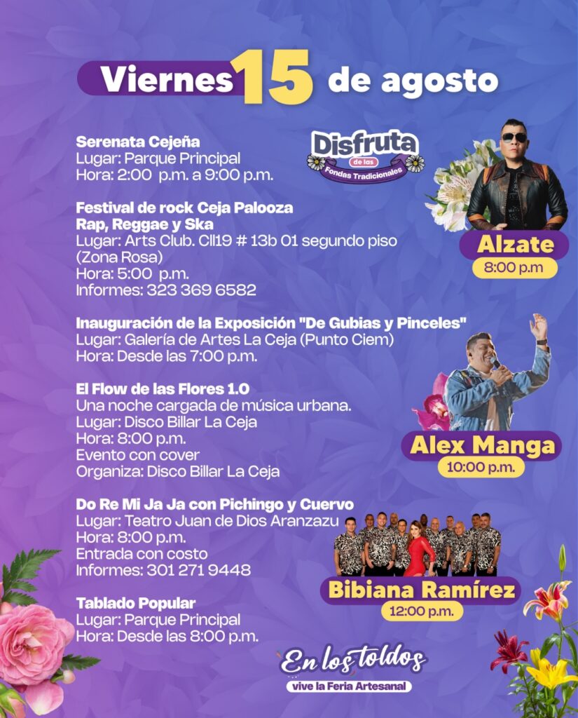 Durante los 10 días de festividades, más de 600 artistas cejeños se presentarán en el tablado principal y en escenarios alternos, incluyendo a Fredy Bermúdez, Magangué Orquesta, Orquesta Cañaveral, Terracota, Beera, Dylan, La Ceja a la Plancha, Estudiantina La Alborada del Tambo, ReDanCe, entre otros.
