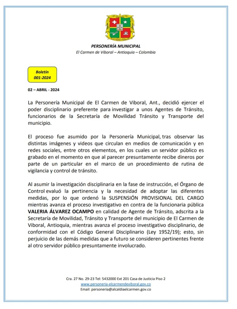 “El proceso fue asumido por la Personería Municipal, tras observar las distintas imágenes y videos que circulan en medios de comunicación y en redes sociales, entre otros elementos, en los cuales un servidor público es grabado en el momento en que al parecer presuntamente recibe dineros por parte de un particular en el marco de un procedimiento de rutina de vigilancia y control de tránsito.” Señala un aparte del comunicado