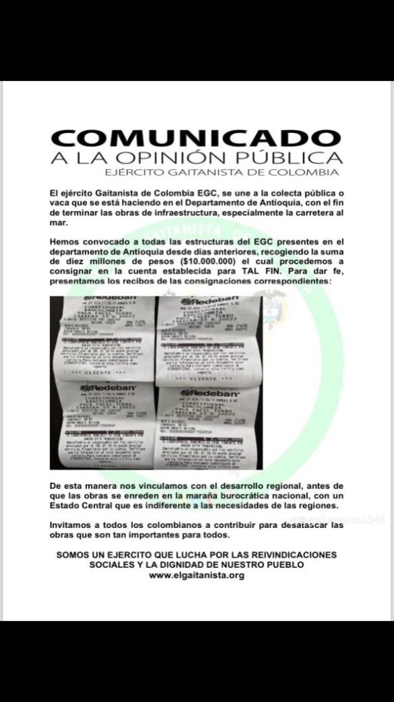 La polémica de la donación que vienen haciendo los antioqueños, se dió luego de conocido un supuesto comunicado de las Autodefensas Gaitanistas de Colombia (Clan del Golfo) donde indican que donaron 10 millones de pesos.