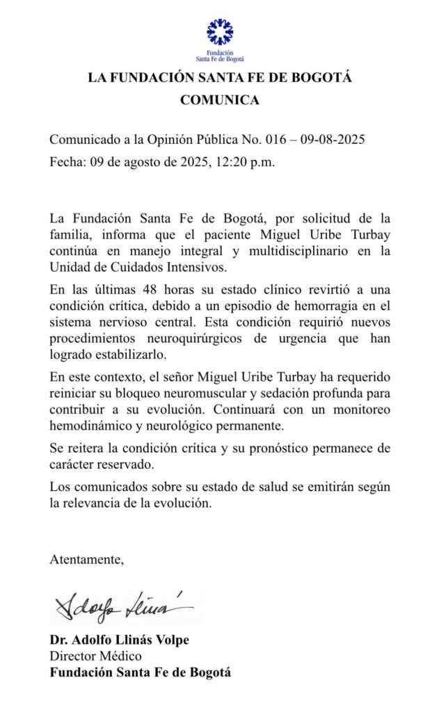 La Fundación Santa Fe informó a través de un comunicado hace unos minutos, que luego de una hemorragia, el Senador y Precandidato Presidencial, Miguel Uribe Turbay vuelve a estado crítico.