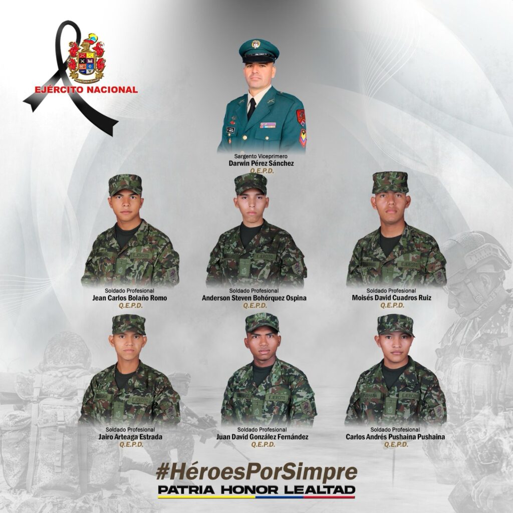 El Ministro de Defensa, Pedro Sánchez, detalló: “Esto representa una traición a esos compromisos para transformar el territorio hacia la paz, pero también un crimen atroz, un delito muy grave frente a la constitución política y la ley colombiana. Asesinar a un militar o a un policía es un grave delito que, de acuerdo a nuestra legislación, acarrea hasta 37 años de cárcel, independientemente de si cumplen o no cumplen el derecho internacional humanitario los criminales”, expresó Sánchez.