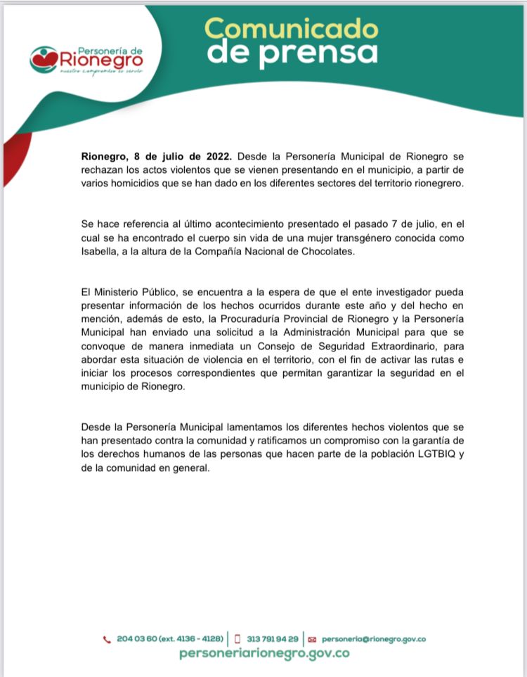 La personería municipal de Rionegro emitió un comunicado en el que expresa su rechazó del homicidio de una persona de 32 años de vida, conocida en vida como “Isabella”.