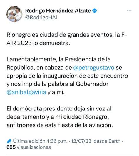 La Administración Municipal de Rionegro, en cabeza de su Alcalde, Rodrigo Hernández Alzate, en representación de todos los rionegreros, quiere manifestar su inconformidad frente al irrespetuoso gesto del Presidente de Colombia, Gustavo Petro, quien deliberadamente decidió excluir, tanto al Alcalde de Rionegro, Rodrigo Hernández, como al Gobernador de Antioquia, doctor Aníbal Gaviria Correa, de la oportunidad de dirigir sus palabras a los asistentes al acto de protocolo de la inauguración de la Feria Aeronáutica F- AIR Colombia 2023.