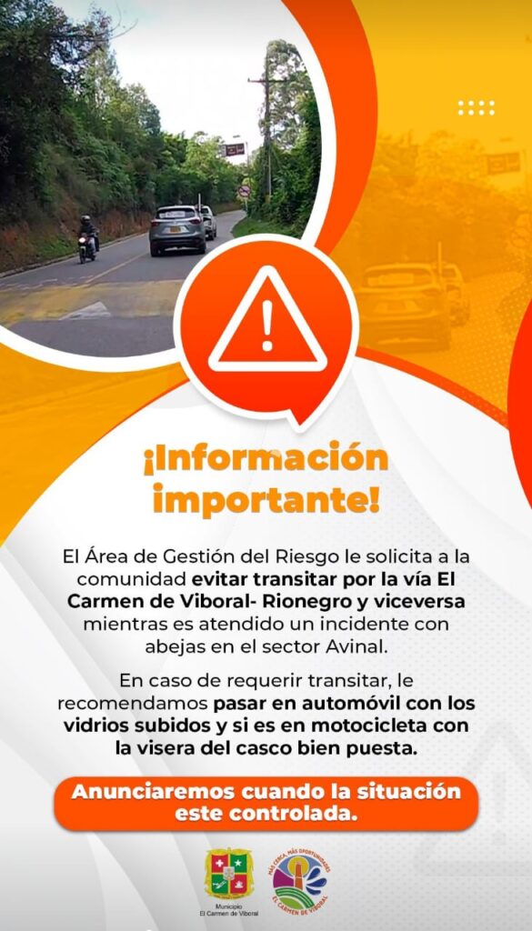 El Área de Gestión del Riesgo le solicita a la comunidad evitar transitar por la vía El Carmen de Viboral- Rionegro y viceversa mientras es atendido un incidente con abejas en el sector Avinal.